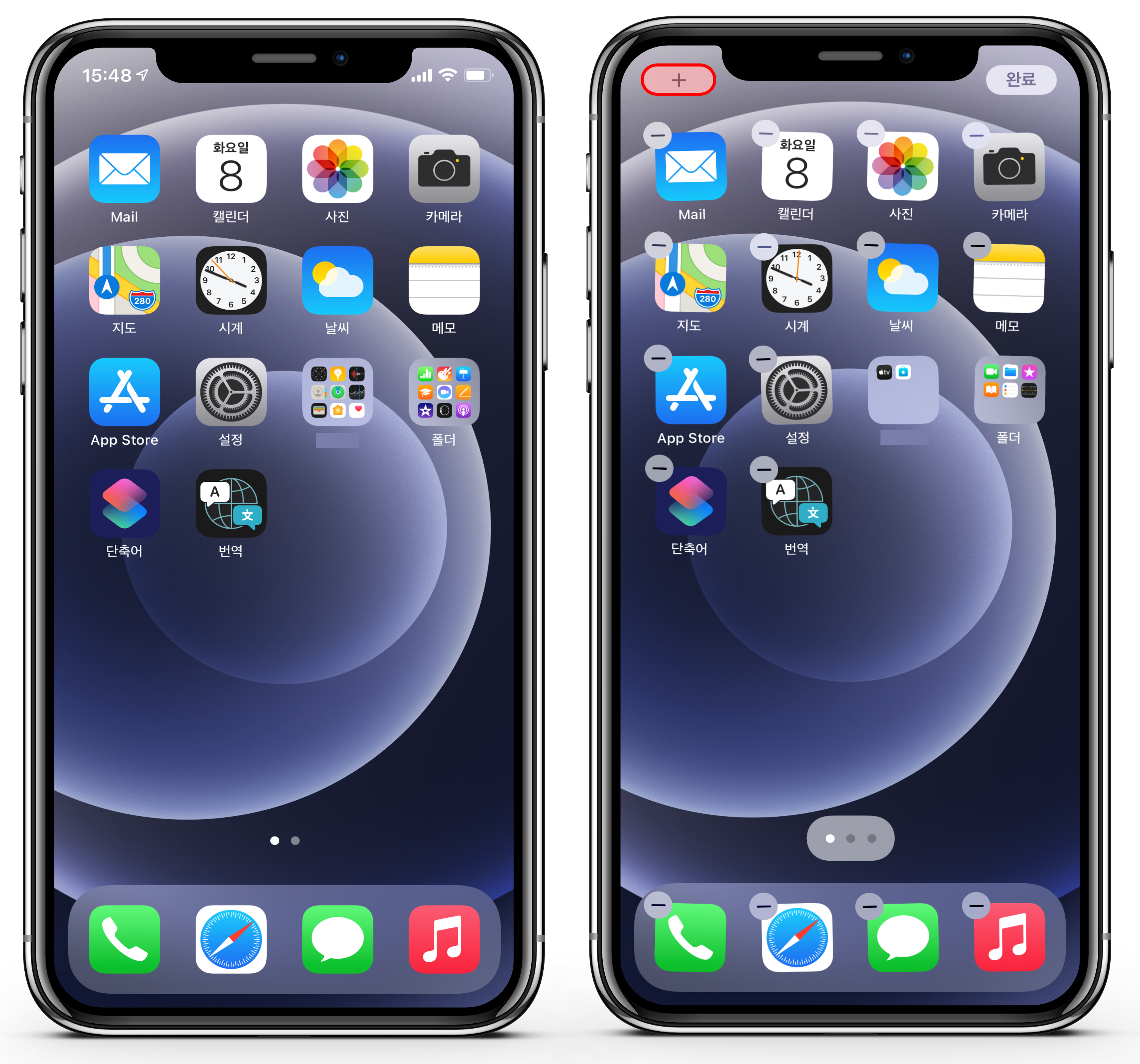 홈 화면에서 빈 곳을 길게 눌러서 편집 화면으로 전환되면, 좌측 상단의 + 버튼을 선택합니다.