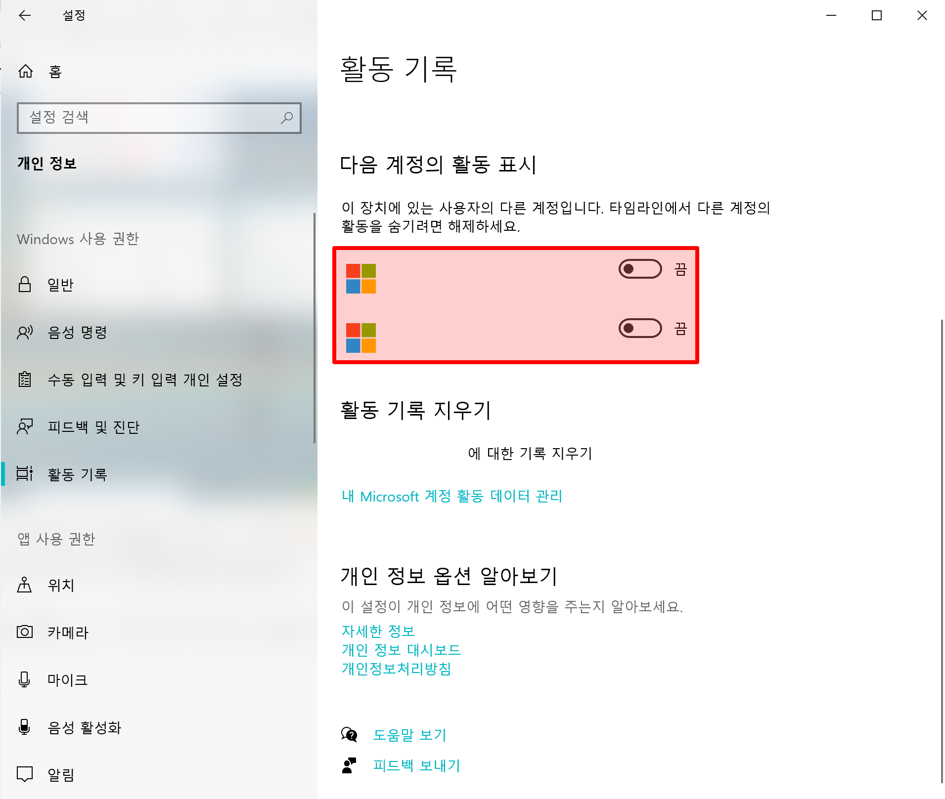 개인 정보 설정에서 좌측 메뉴의 활동 기록 탭으로 진입한 후, 이 장치에 내 활동 기록 저장의 체크 표시를 해제합니다.