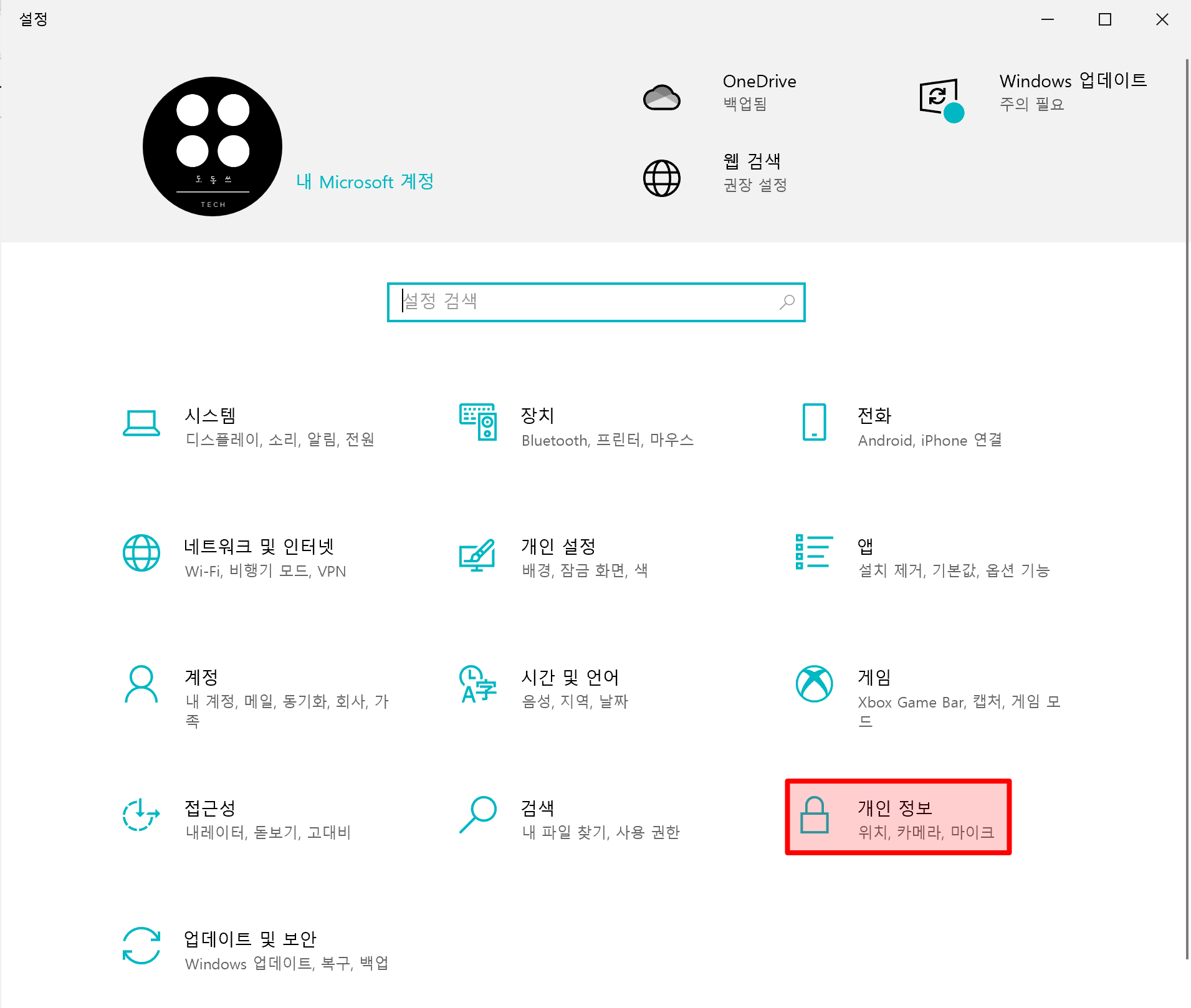 만약, 위와 같은 활동 기록이 남는 것이 싫은 분들은 설정에서 비활성화할 수 있는데요. 설정을 실행한 후, 개인 정보 설정으로 들어갑니다.