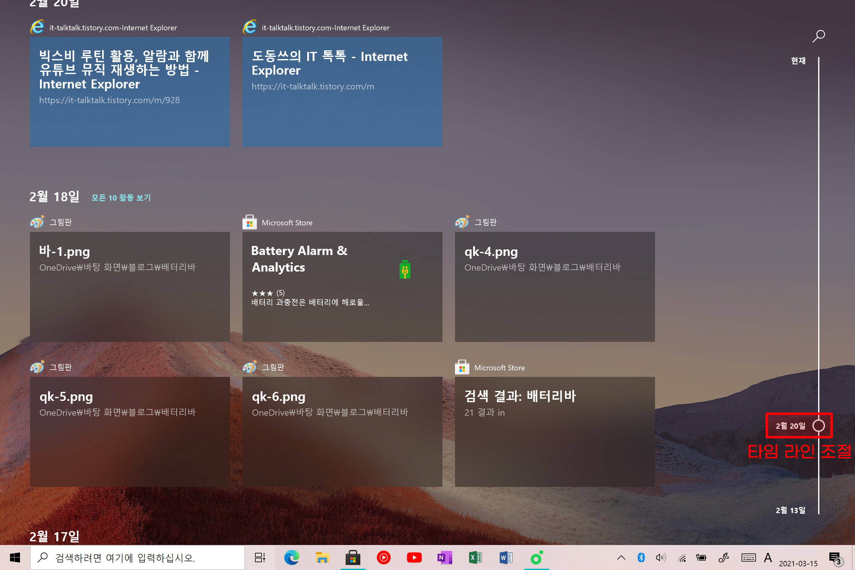 우측에 있는 타임 라인을 조절하여 원하는 날짜에 했던 작업을 살펴볼 수 있습니다. 특정 날짜에 작업한 파일을 찾을 때, 타임 라인을 조절하여 필요한 파일 또는 기록을 찾아보세요.